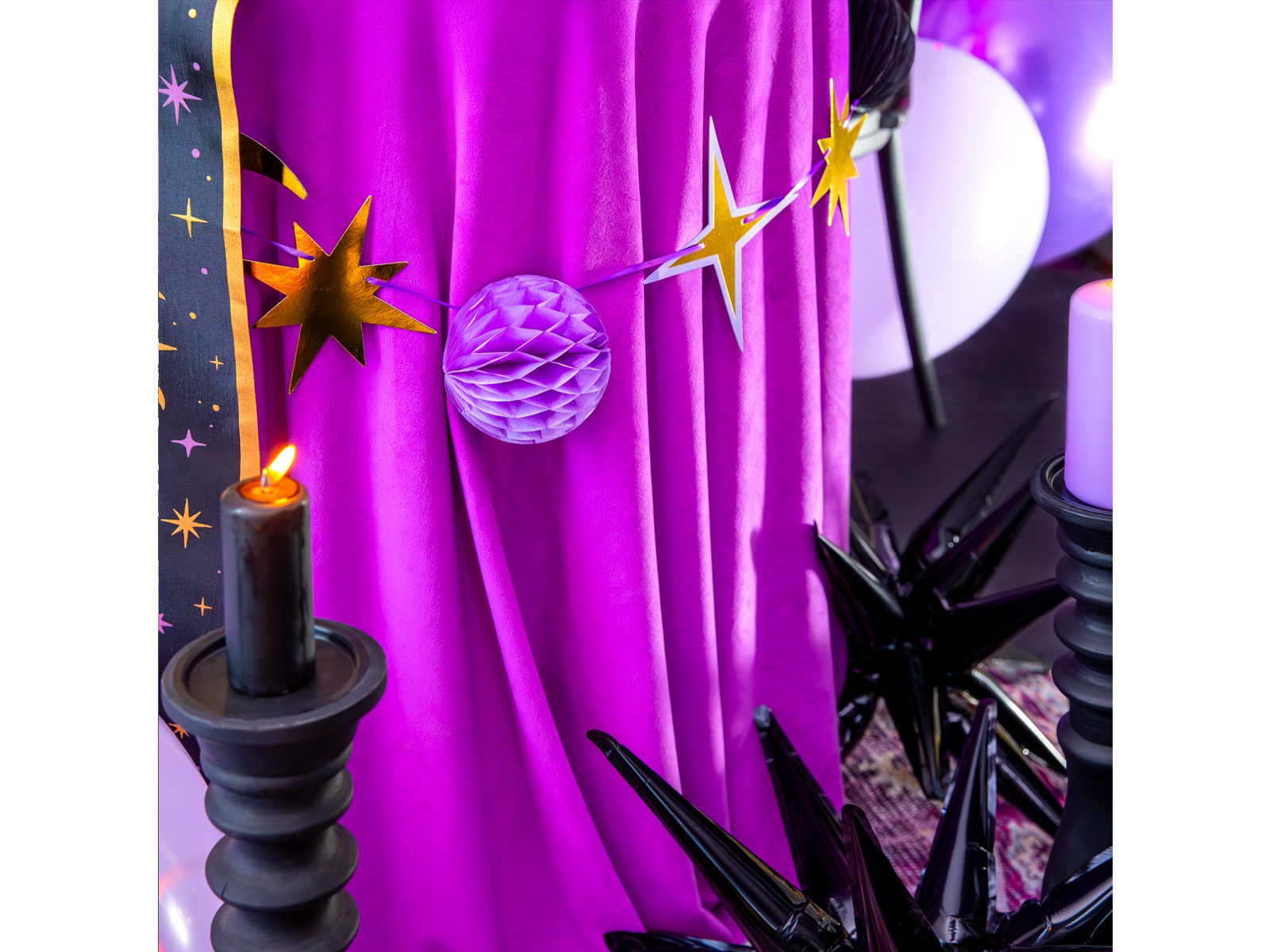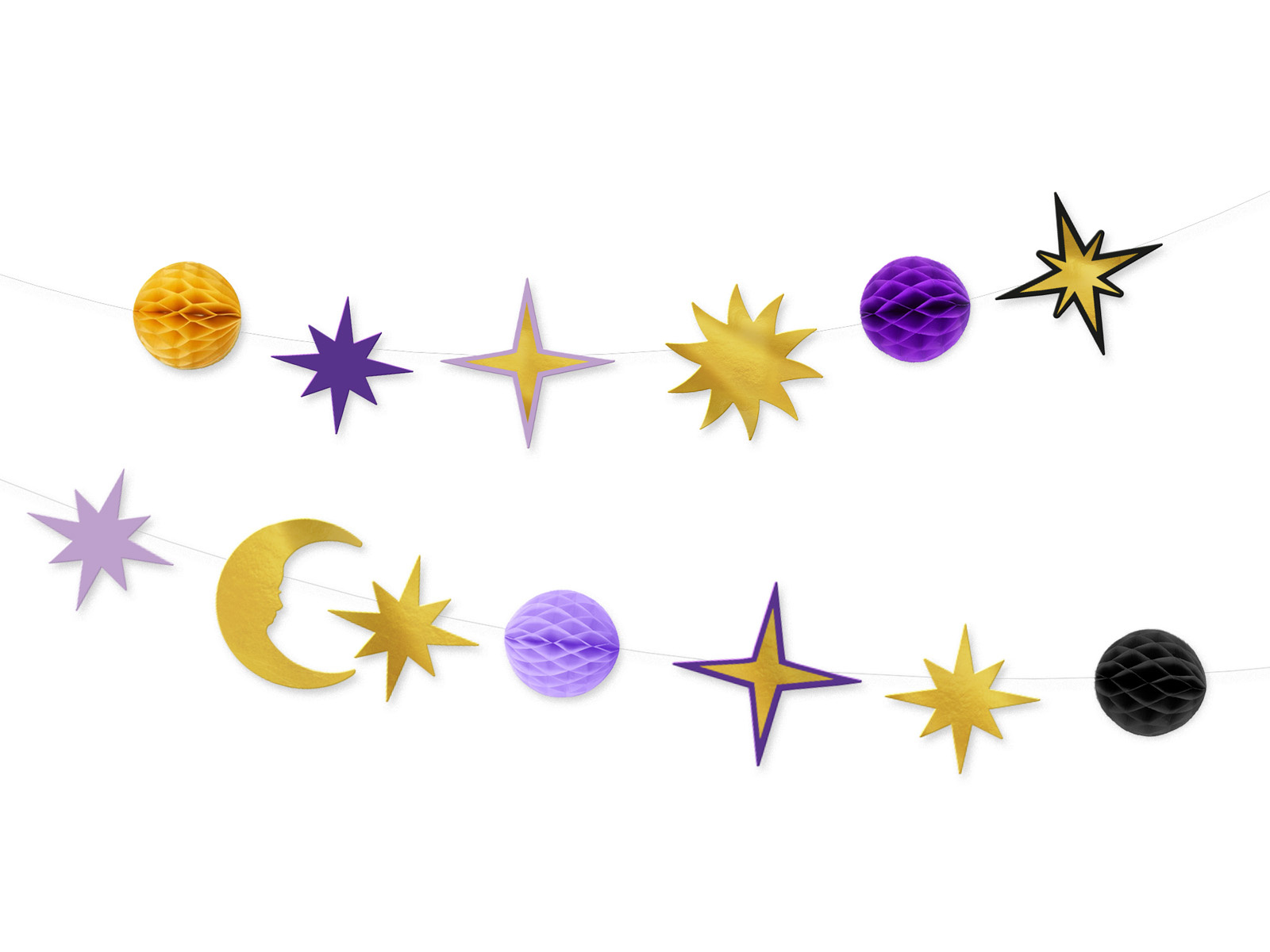W zestawie: honeycomby (4 szt.) - średnica 10 cm, długość razem z zawieszką 17 cm. gwiazdy (7 szt.) - rozmiar 13-16 cm. słońce (1 szt.) - średnica 15 cm. księżyc (1 szt.) - wysokość 14 cm.