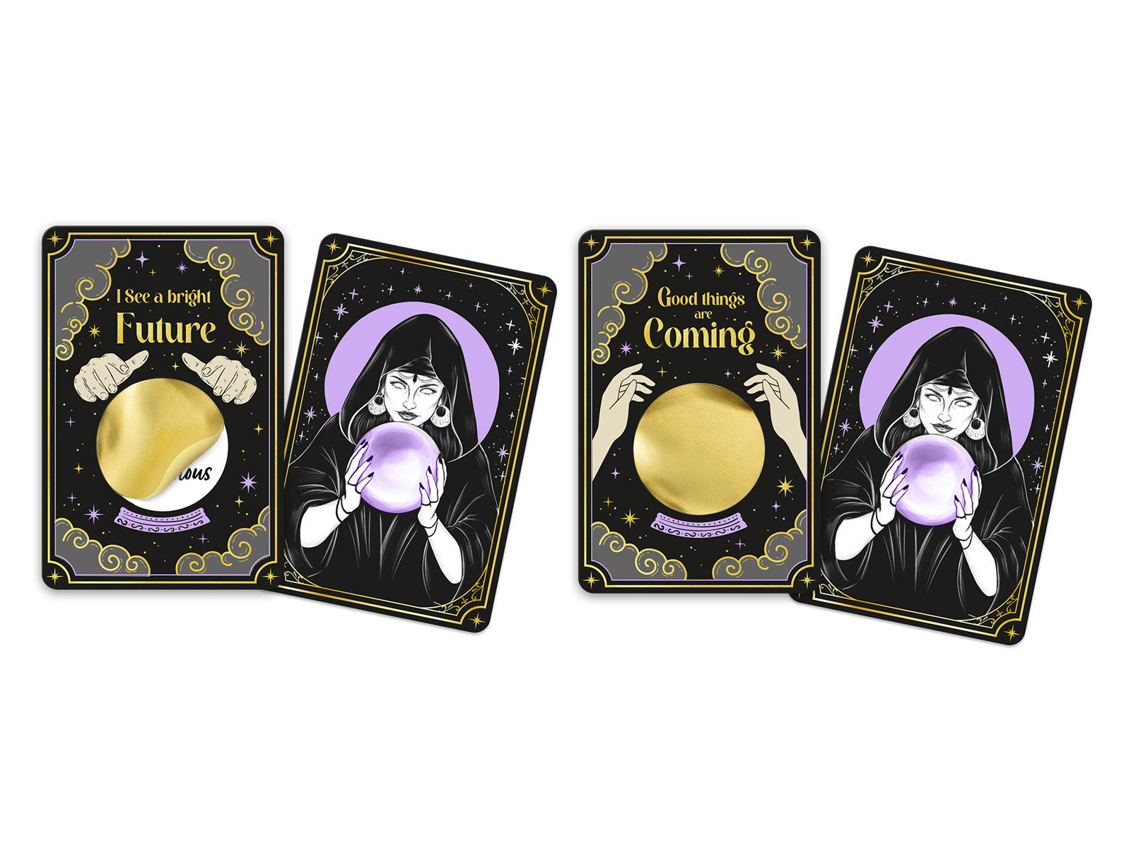 Karty zostały zaprojektowane tak, aby samodzielnie zapisać wróżbę, a następnie przykleić na nią zdrapkę.