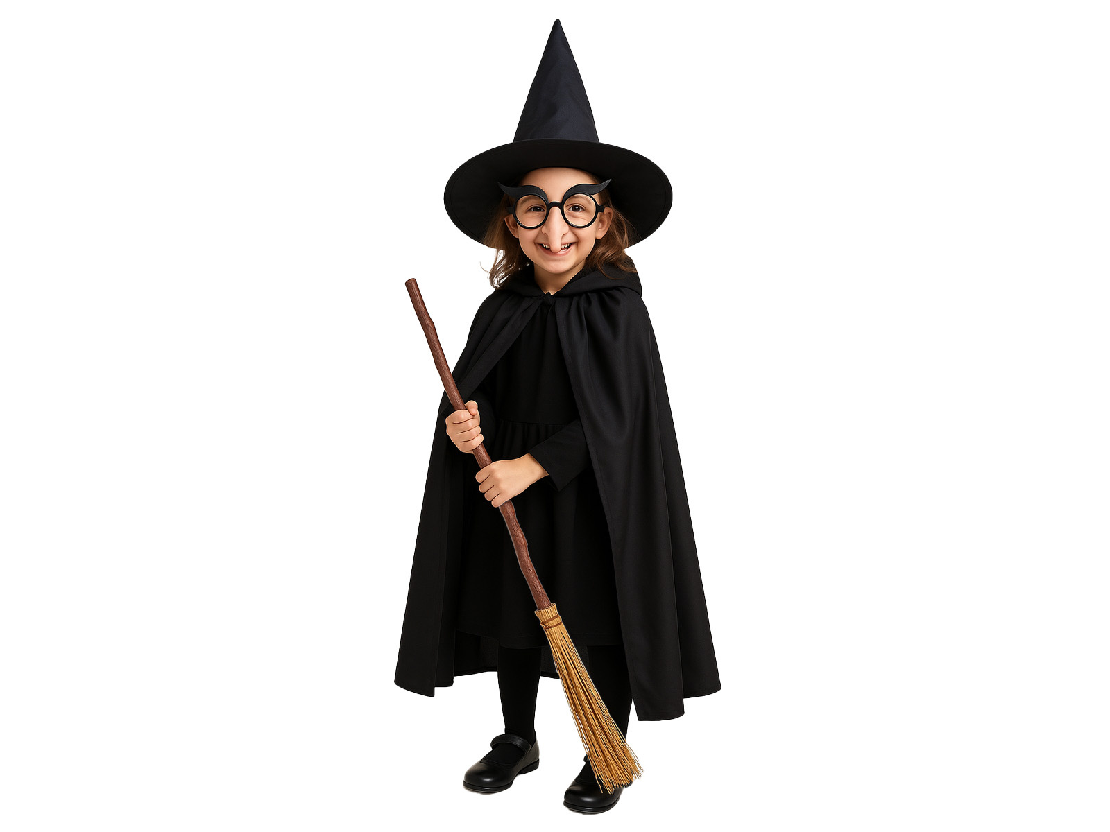 W komplecie: czarna peleryna (Długość: 135 cm.), kapelusz (średnica otworu na głowę 19 cm, średnica ronda 38 cm, wysokość 35 cm) miotła (90 cm), pazury wiedźmy (10 szt) oraz okulary z nosem.