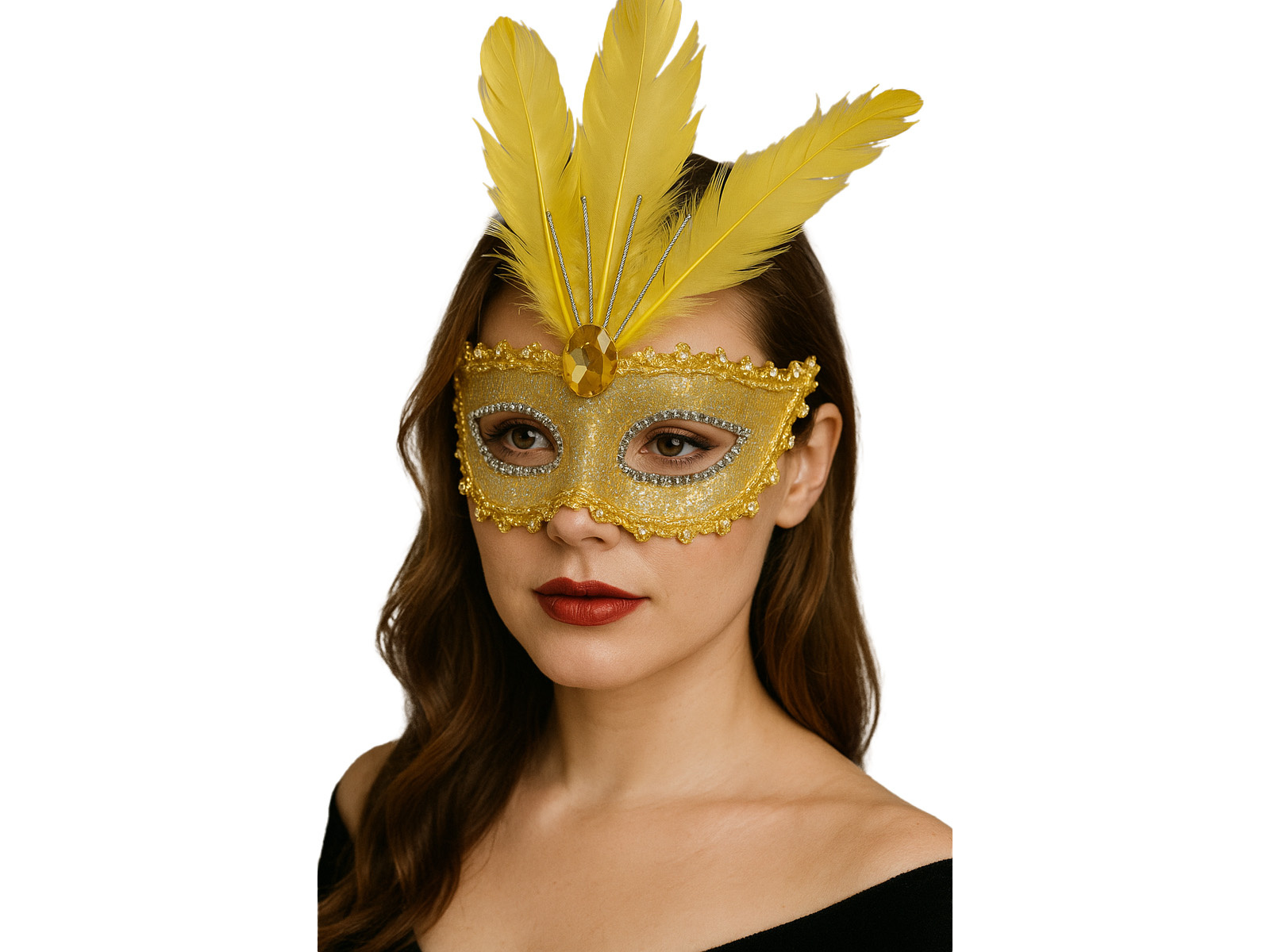 Maska karnawałowa z piórami - żółta - 1 szt.