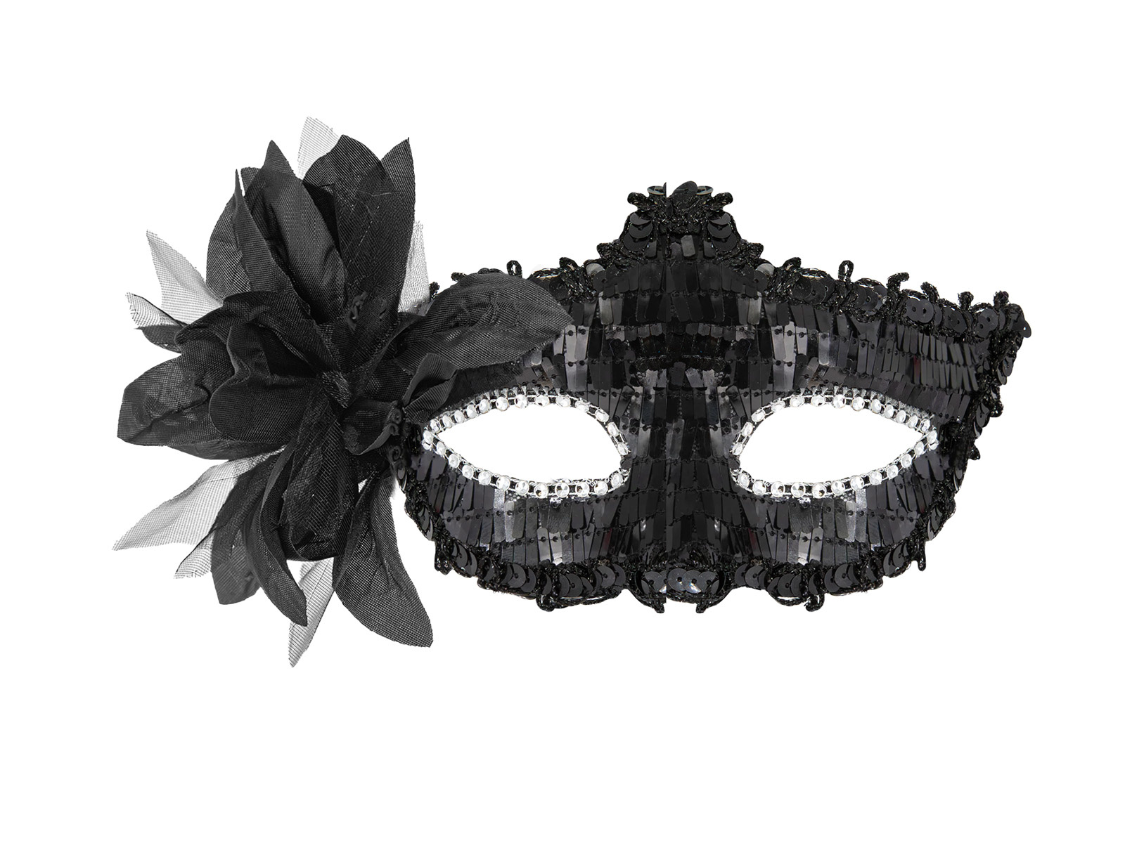 Maska karnawałowa cekinowa z kwiatem - czarna - 1 szt.