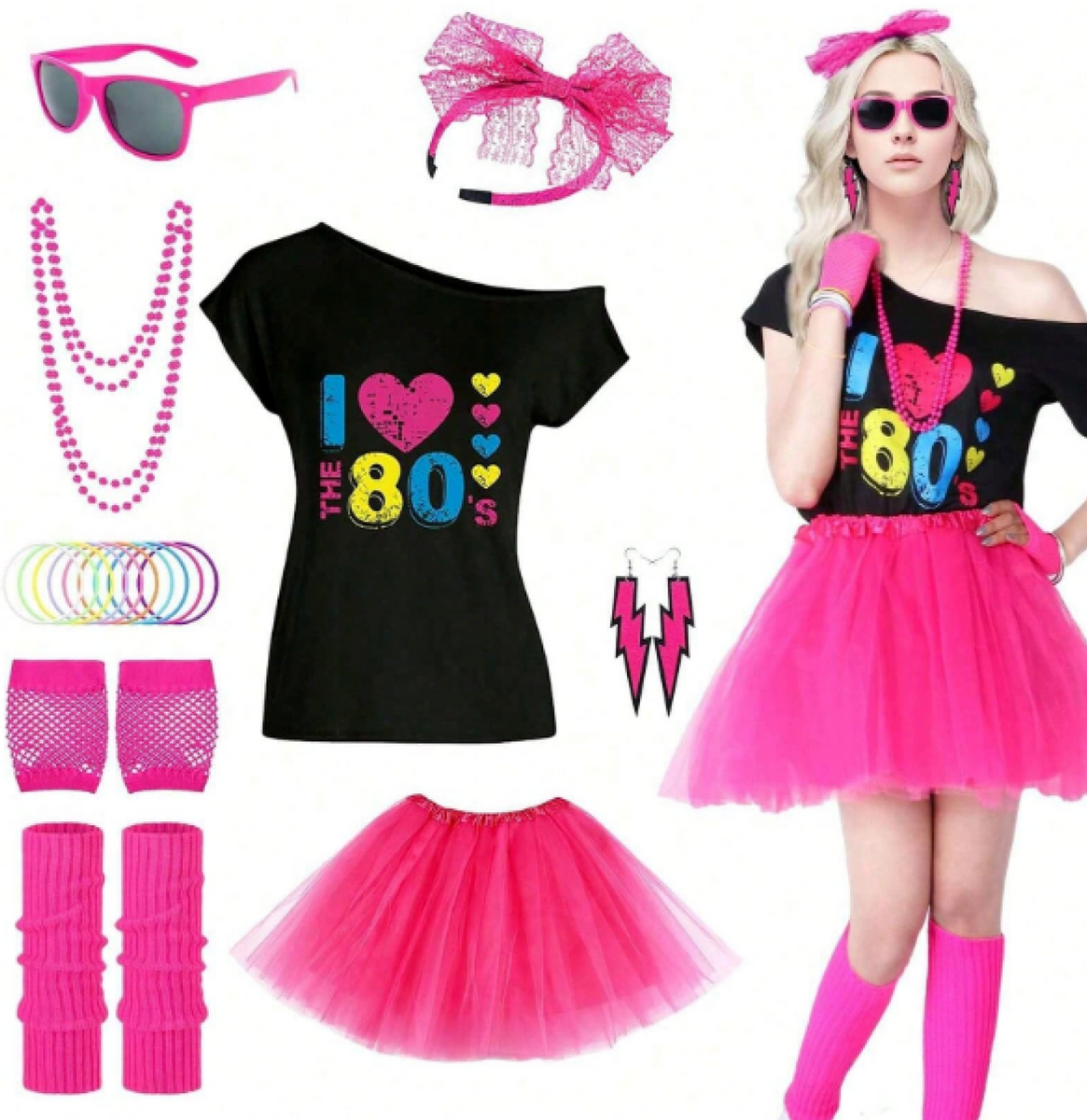 Zestaw Disco 20 elementowy w kolorze różowym do stroju w stylu lat 80-tych.
