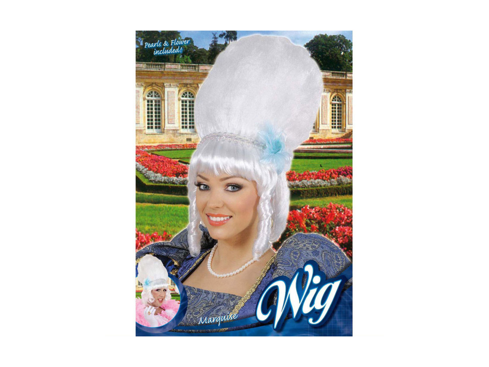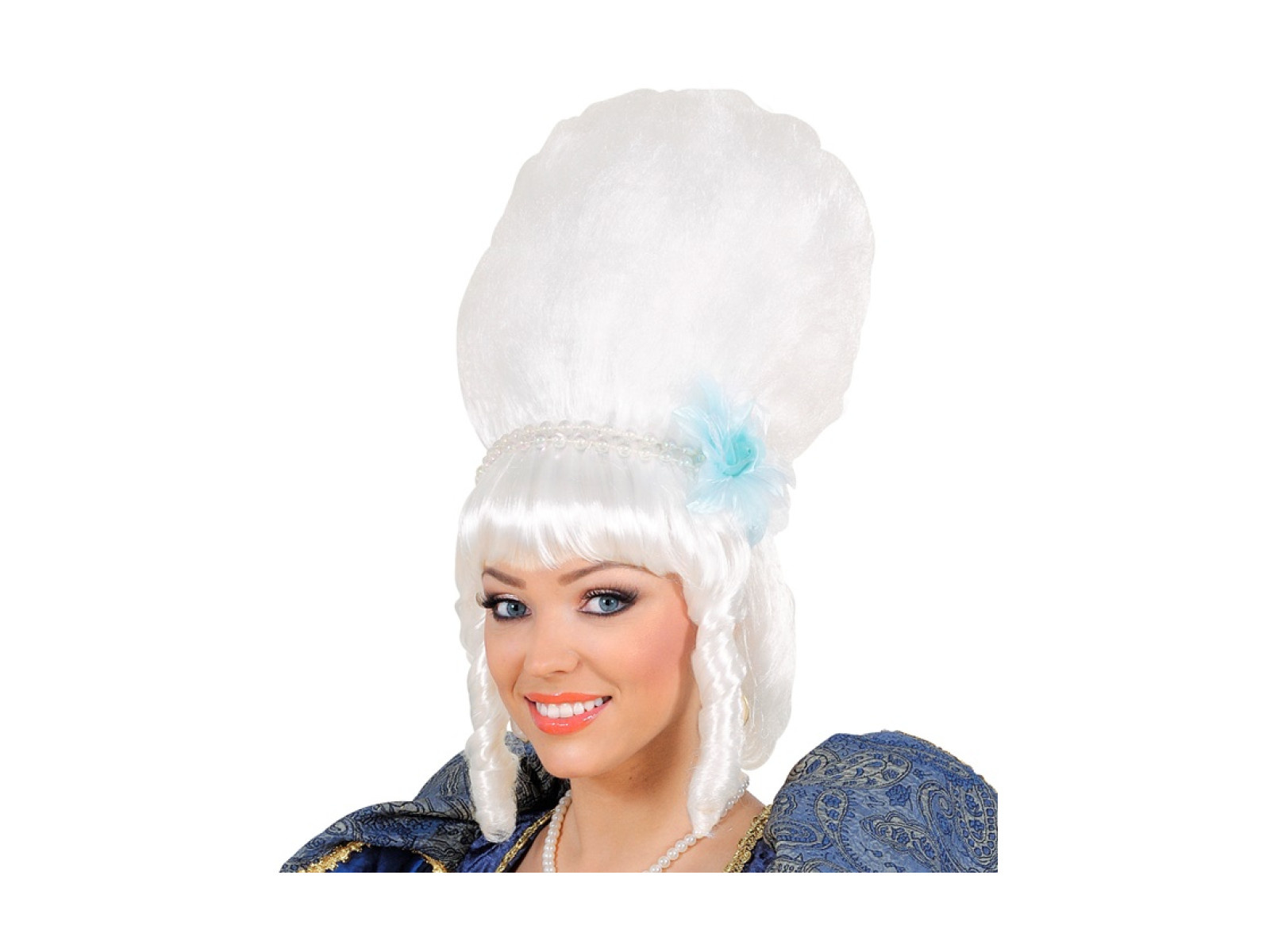 Peruka Markizy z białymi perłami i niebieskim kwiatem