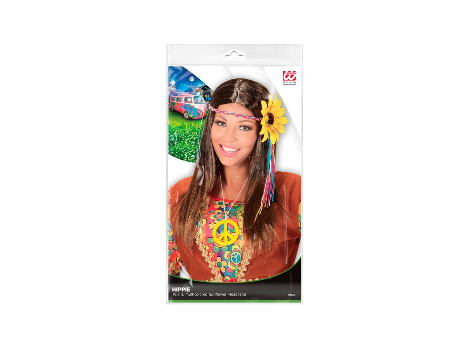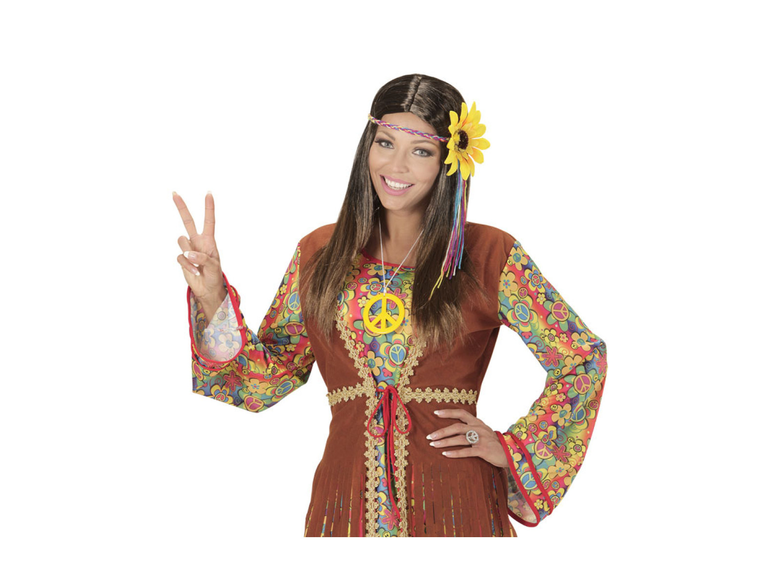 Brązowa peruka hippie z wielokolorową opaską z motywem słonecznika