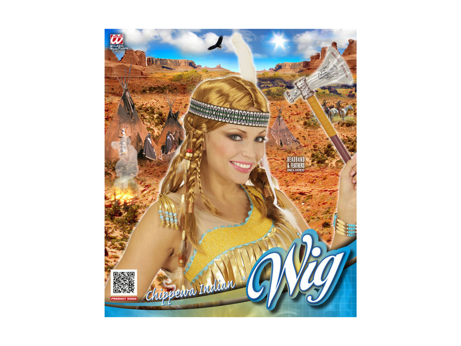 Peruka Indianina Chippewa z warkoczami, koralikami, opaską i piórami