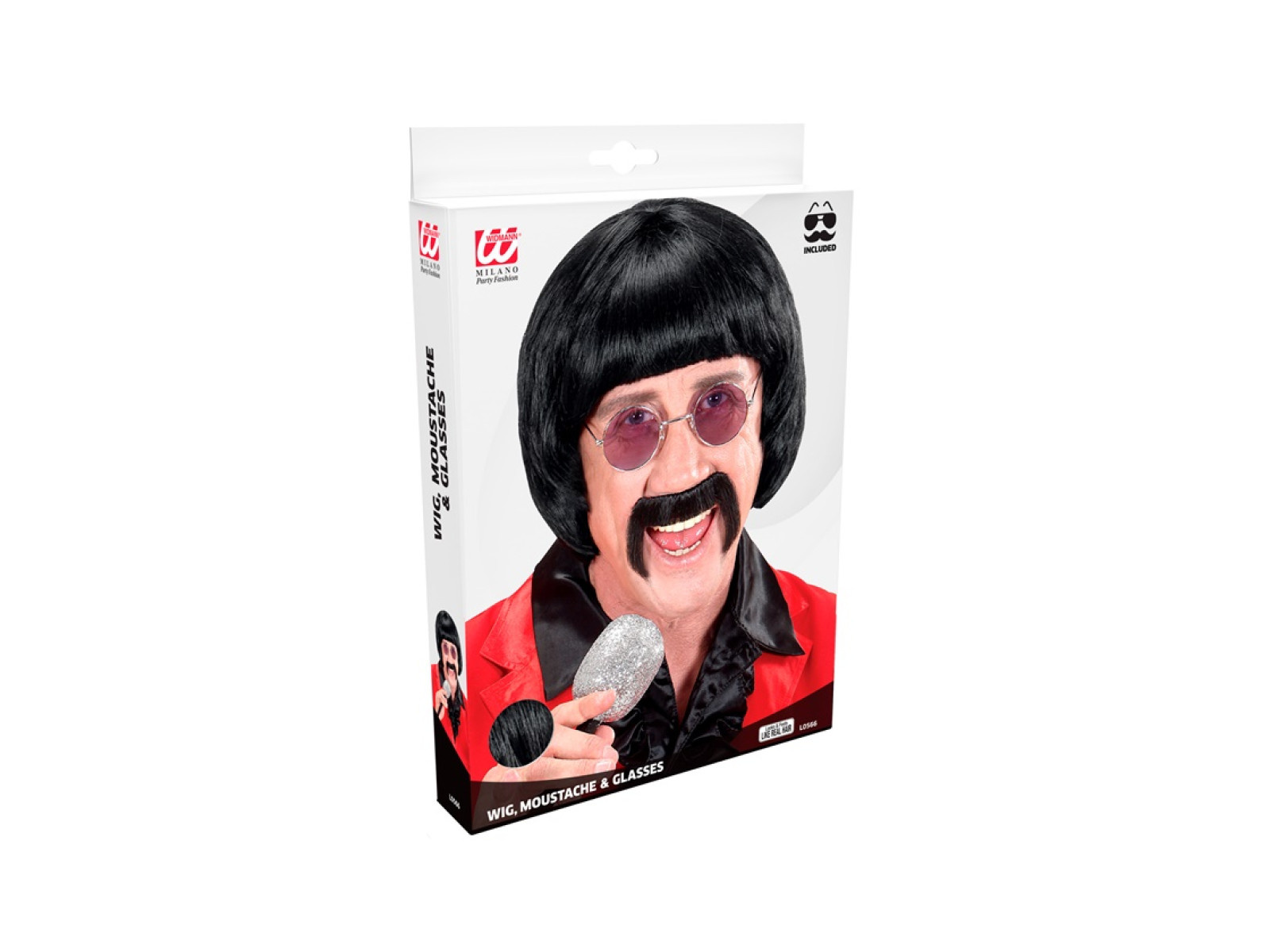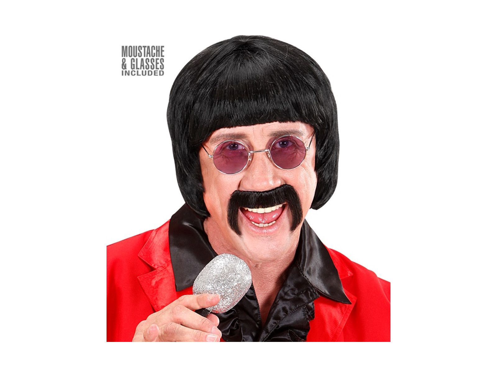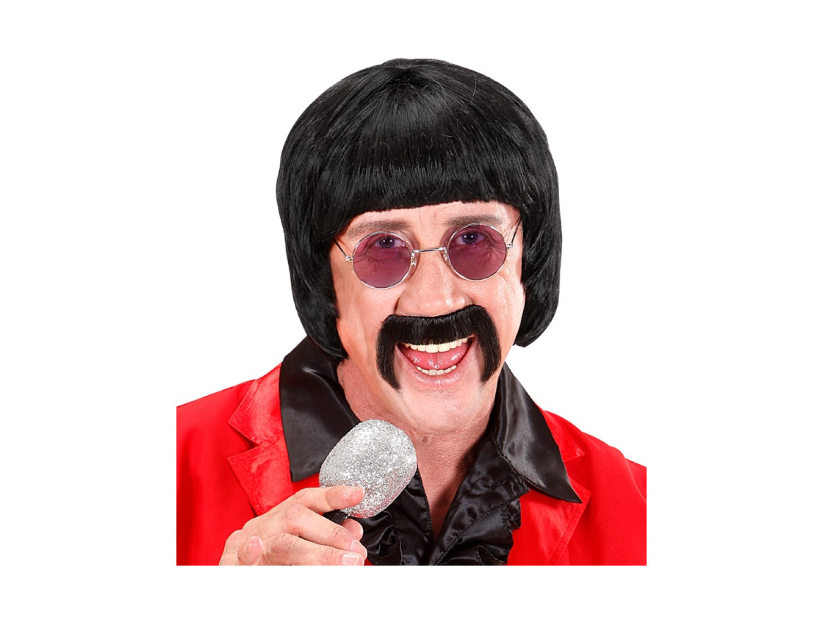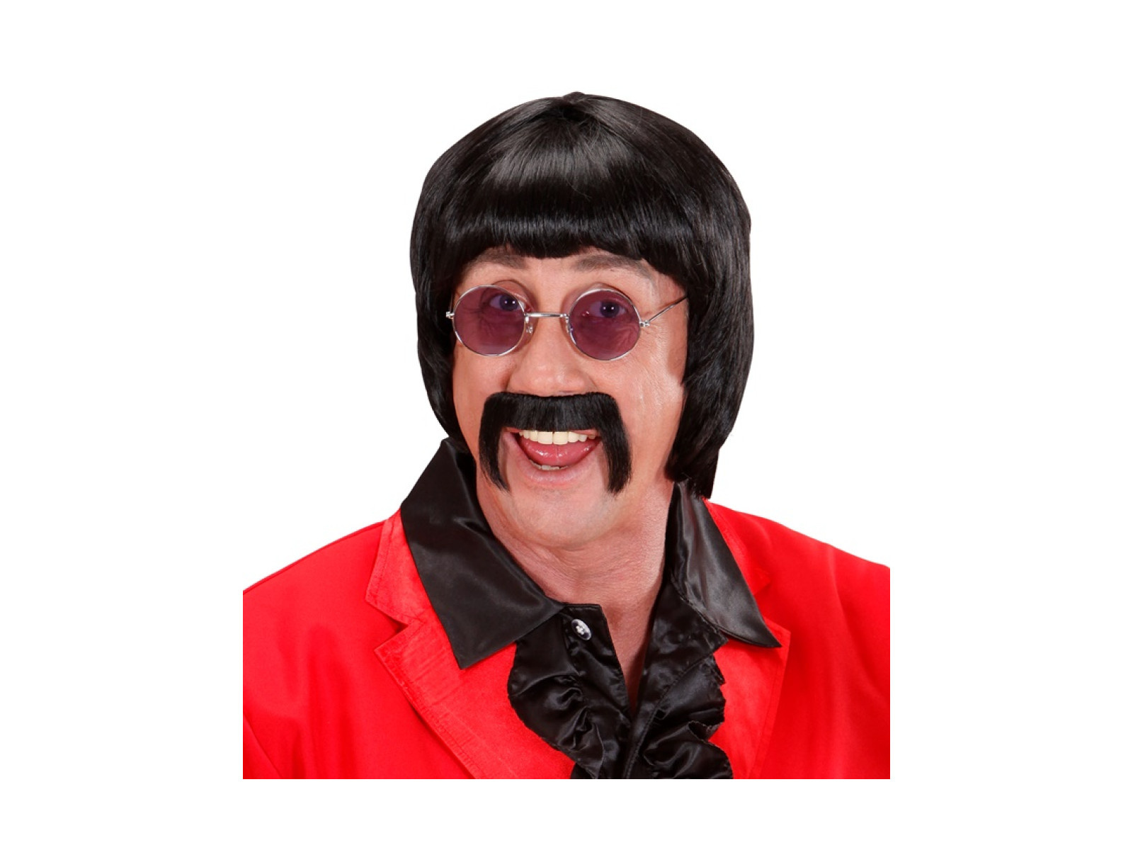 Czarna peruka Music Man z lat 60. z wąsami i okularami