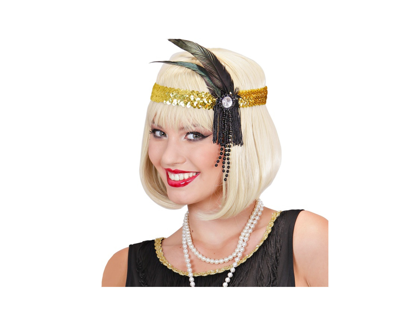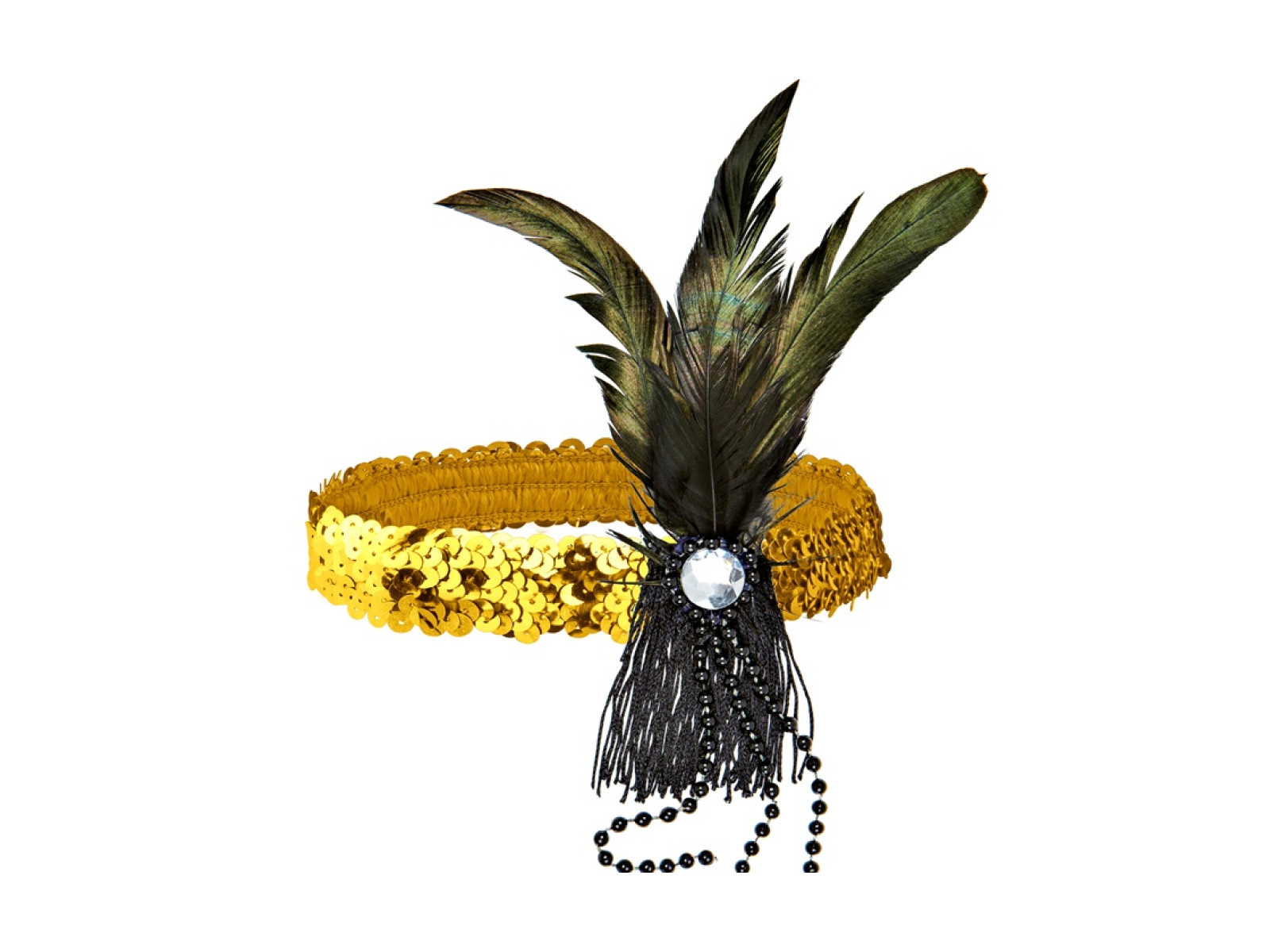 Złota cekinowa opaska z piórem i perłami