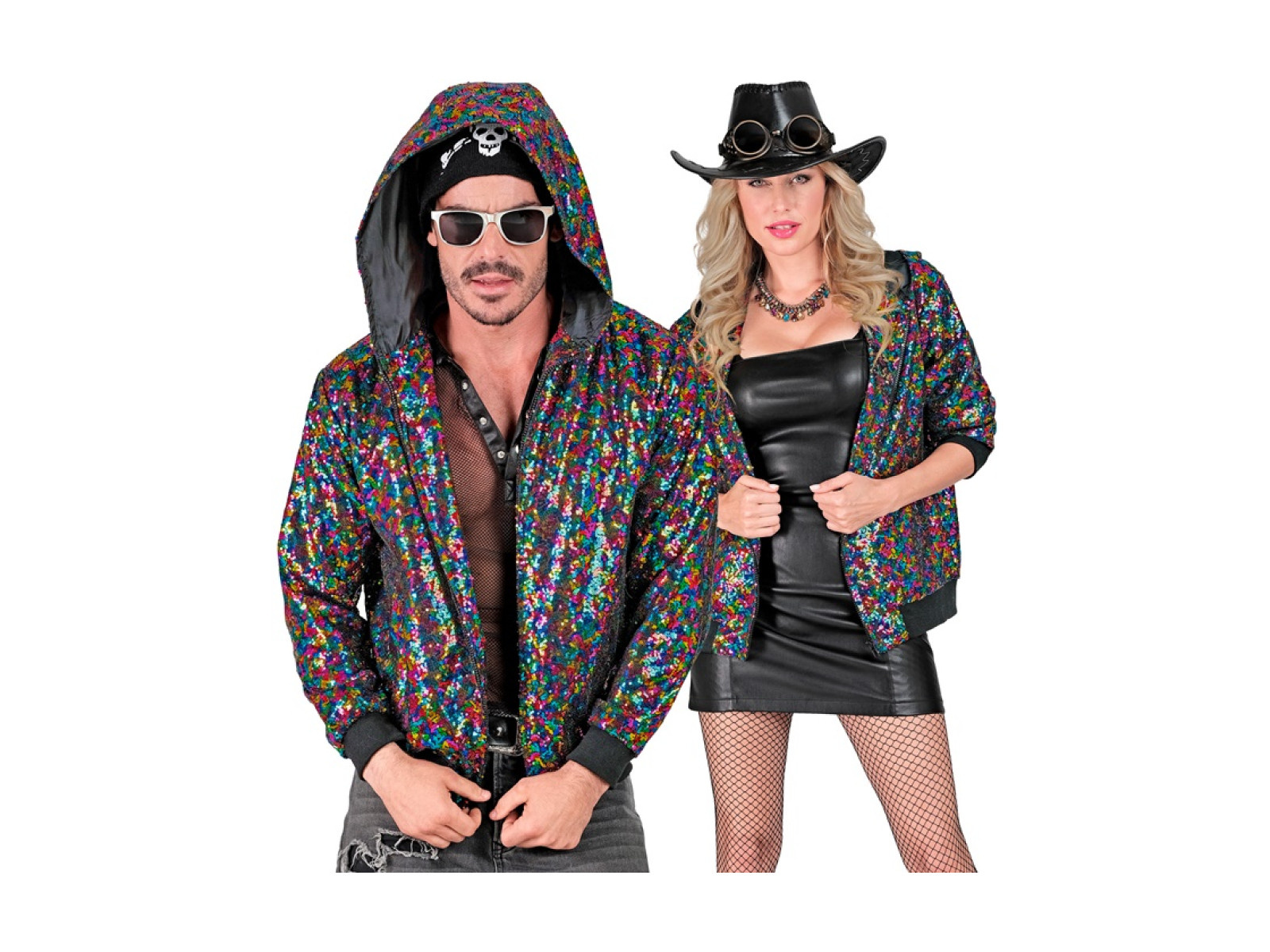 Imprezowa cekinowa kurtka - bomberka z kapturem - multikolor
