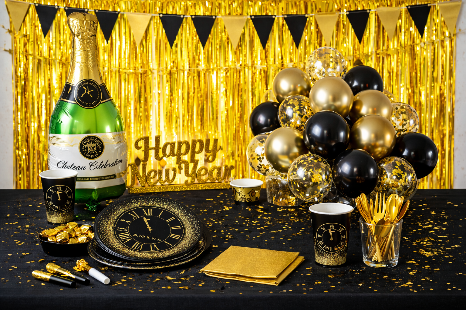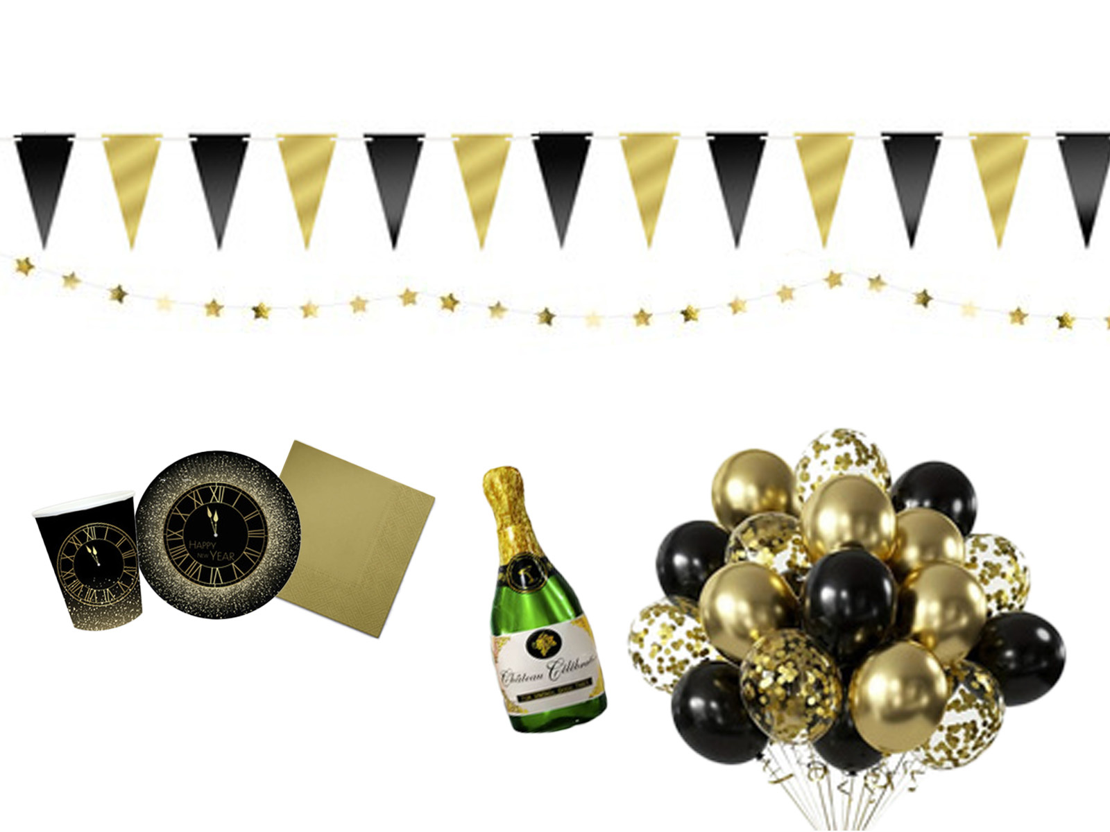 W komplecie: kubeczki (6 szt), talerzyki (6 szt.), baner gwiazdki (360 cm), zestaw balonów lateksowych (26 szt.), baner flagi (500 cm), balon foliowy szampan ( 49x104 cm), serwetki złote (20 szt.), kurtyna złota (100 x 200 cm).