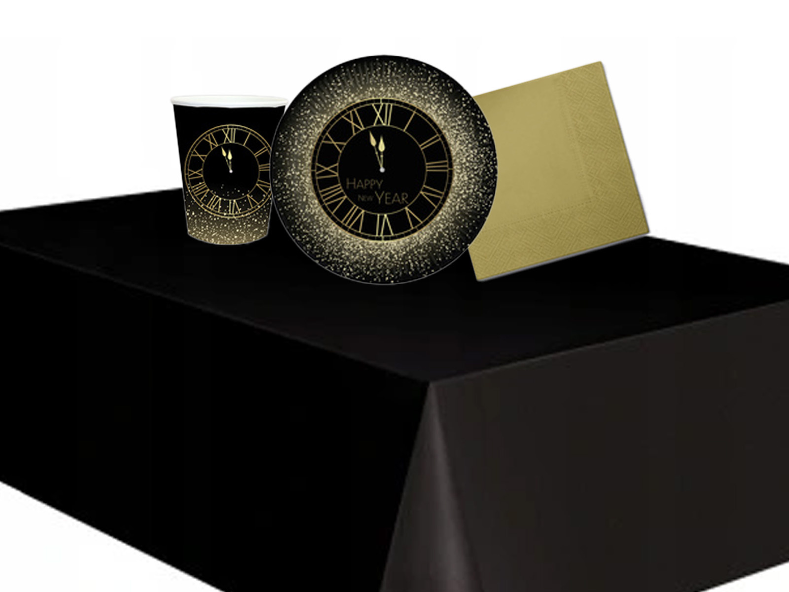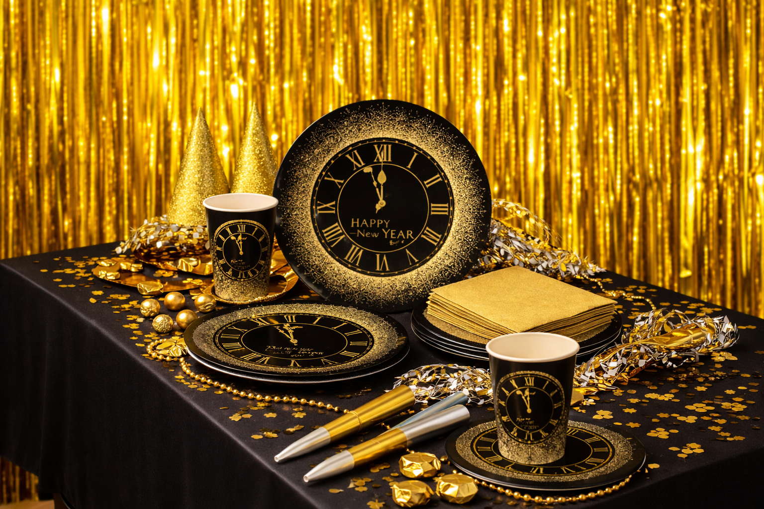 W komplecie: kubeczki (6 szt.), talerzyki (6 szt.), serwetki (20 szt.), obrus czarny (137 x 274 cm) kurtyna złota (100 x 200 cm)