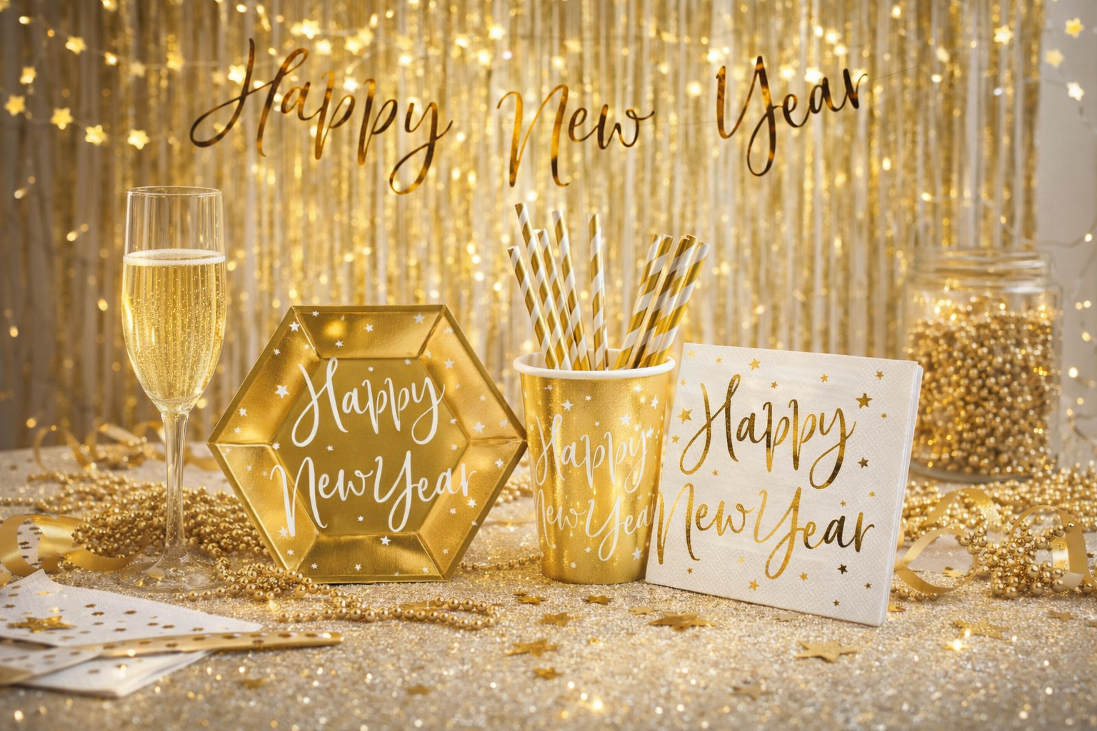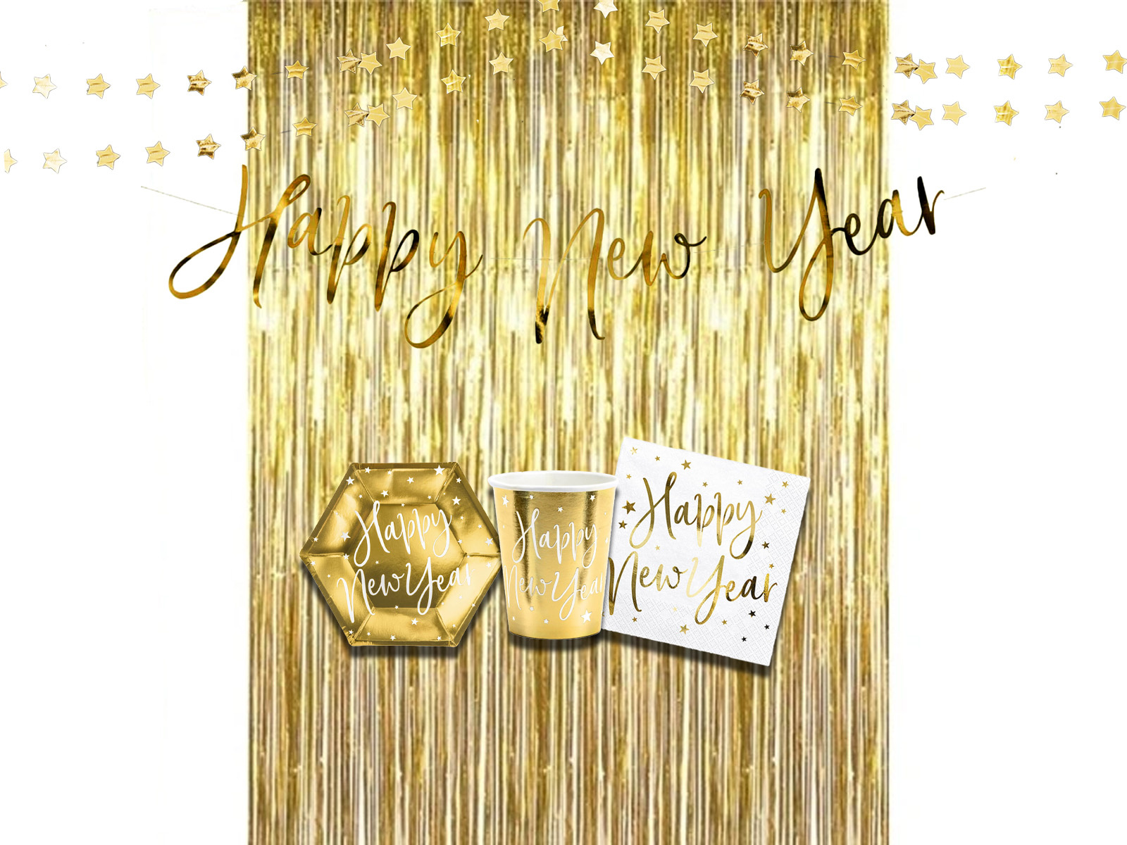 W komplecie: kurtyna złota (100x200 cm), girlanda gwiazdki (360 cm), Baner Happy New Year (66 cm.), talerzyki (6 szt.), kubeczki (6 szt.), serwetki (20 szt.)